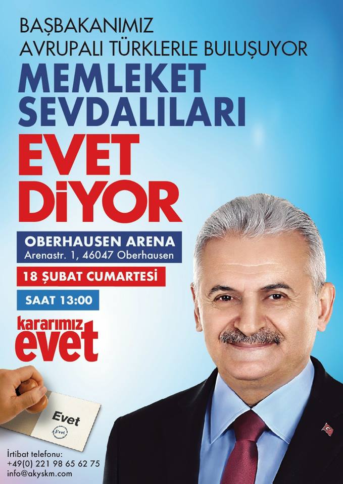 Başbakan Yıldırım’ın, konferans arasında Kuzey Ren Vestfalya’daki Oberhausen’e de geçerek, Türk vatandaşlarıyla buluşması bekleniyor. “Memleket Sevdalıları Evet Diyor” başlıklı etkinlikte Yıldırım’ın, 15 bin civarında Türk vatandaşına seslenmesi planlanıyor.