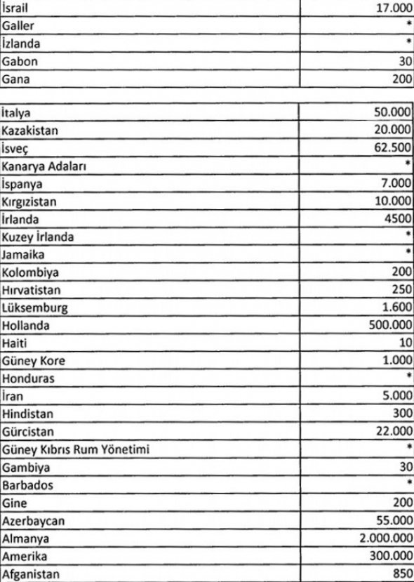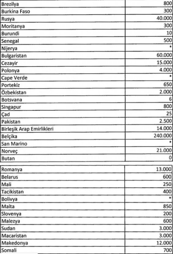 Tanrıkulu’nun önergelerini toplu olarak 14 Ocak 2019’da yanıtlayan Dışişleri Bakanı Mevlüt Çavuşoğlu, verdiği cevapta yurt dışındaki vatandaşların sayısının ülkelere göre dağılımını da paylaştı. 152 ülkeyi kapsayan tabloya göre, 5 milyon Türk yurt dışında yaşarken, en çok Türk vatandaşının bulunduğu yer 2 milyon kişiyle Almanya oldu.