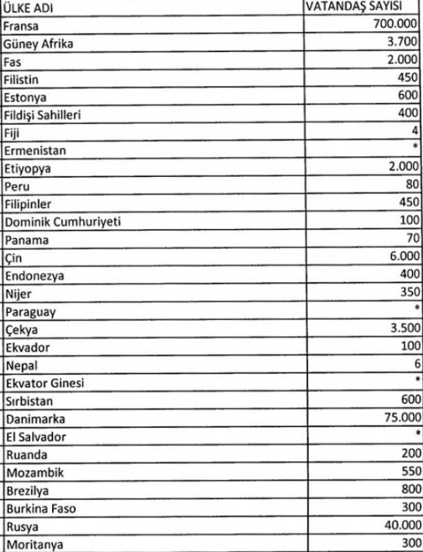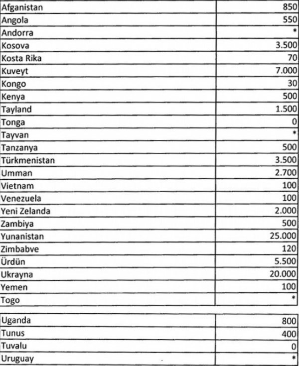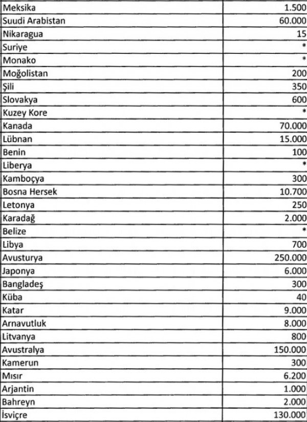 Bütan, Tonga, Tuvalu’da hiç Türk  yaşamazken, Ermenistan, Paraguay, Ekvator Ginesi, El Salvador, Nijerya, Cape Verde, San Marino, Bolivya, Suriye, Monako,  Kuzey Kore, Liberya, Belize, Galler,  İzlanda, Kanarya Adaları, Kuzey İrlanda, Jamaika, Honduras, Güney Kıbrıs Rum Yönetimi, Barbados, Andorra, Tayvan, Togo ve Uruguay’da yaşayan Türk vatandaşları ile ilgili verinin ise bulunmadığı ifade edildi.