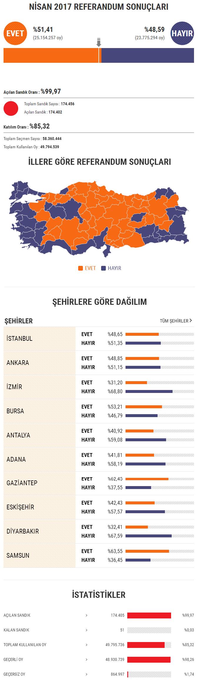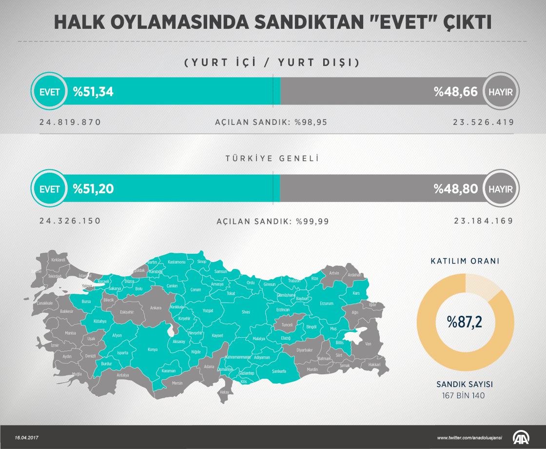 Yurt içinde katılımın yüzde 87,28 olduğu halk oylamasında yüzde 51,21 “evet”, yüzde 48,79 “hayır” oyu çıktı.