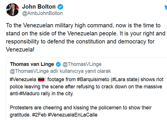 Bolton, Twitter hesabından yaptığı açıklamada, Venezuela ordusundaki yüksek rütbeli komutanlara çağrıda bulundu.Bolton, açıklamasında, “Venezuela ordusunun yüksek rütbeli komutanları, şimdi Venezuela halkının yanında yer alma zamanıdır. Venezüella için anayasayı ve demokrasiyi korumak sizlerin sorumluluğu ve hakkıdır” ifadelerini kullandı.