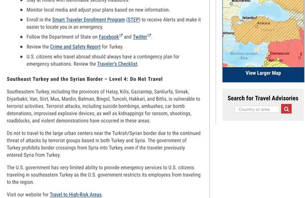 ABD Dışişleri Bakanlığı’nın 28 Haziran’da güncellediği ‘seyahat uyarısında’, Türkiye’ye seyahat etmeyi planlayan Amerikan vatandaşları olası terör eylemlerinin yanı sıra ‘keyfi gözaltılara’ karşı da uyarıldı. Bültende “Terör nedeniyle Türkiye-Suriye sınırı boyunca uzanan bölgelere ve Güneydoğu bölgesinde Hatay, Kilis, Gaziantep, Şanlıurfa, Şırnak, Diyarbakır, Van, Siirt, Muş, Mardin, Batman, Bingöl, Tunceli, Hakkâri ve Bitlis’e seyahat etmeyin” denildi.