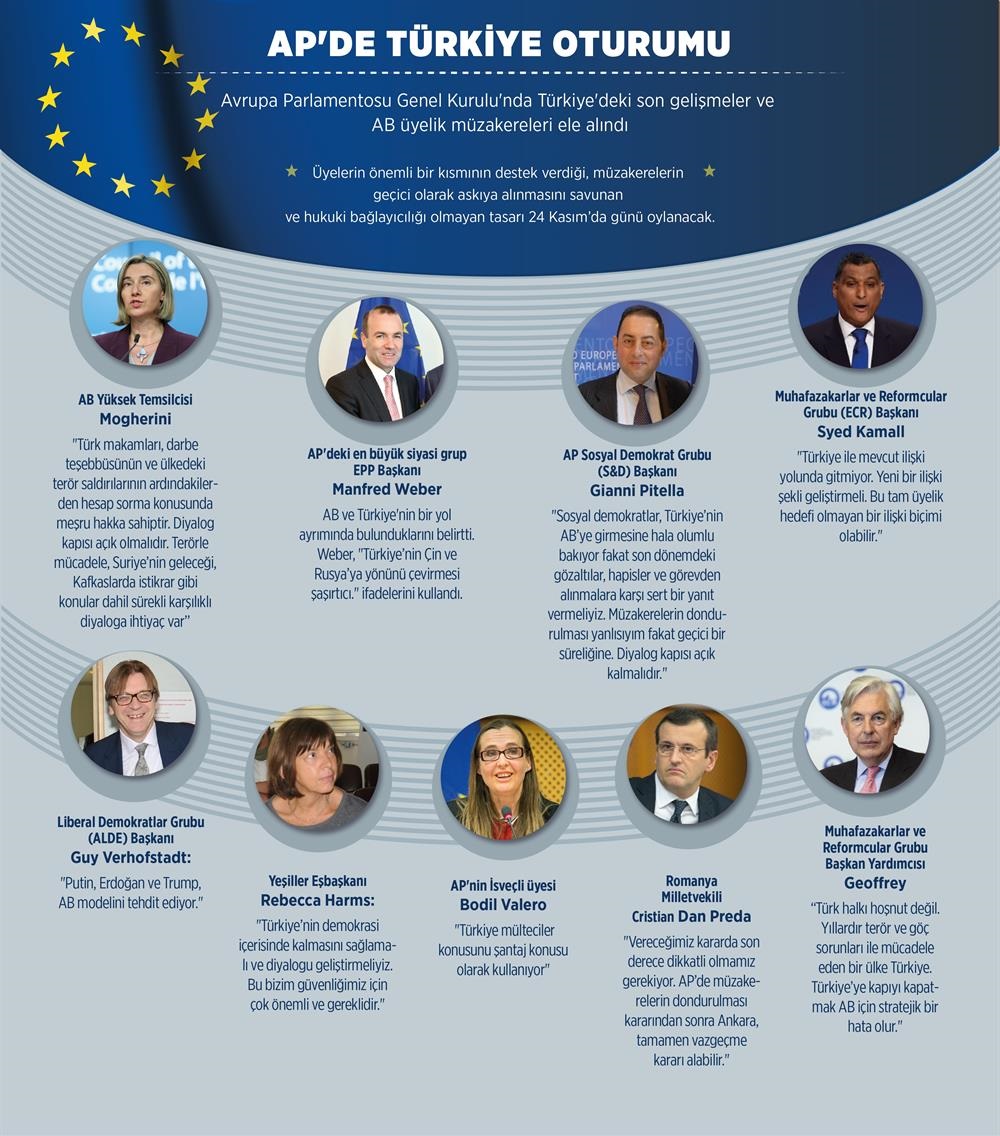 Avrupa Parlamentosu, Avrupa Birliği ile Türkiye arasında 3 Ekim 2005’te başlatılan üyelik müzakerelerinin geçici olarak dondurulmasını öngören karar tasarısını dün onayladı. Onaylanan karar tasarısının hukuki bağlayıcılığı bulunmuyor. AP Genel Kurulunda salı günü görüşülen ve bugün oylanan tasarı 37’ye karşı 479 oyla kabul edildi. Oylamada, 107 üye çekimser görüş bildirdi.