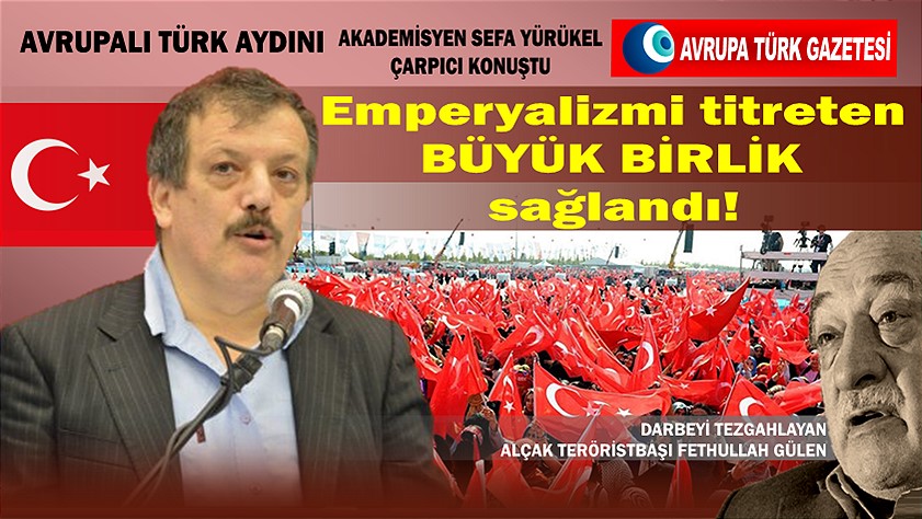 Sosyal-antropolog Sefa Yürükel, gazeteci Oğuzhan Kılıç’a yaptığı açıklamada, Avrupalı Türkler gözüyle, 15 Temmuz kanlı FETÖ’cü darbe girişiminden sonra Fethullahçı Terör Örgütü’ne (FETÖ) karşı Yenikapı mitingine 5 milyona yakın katılımla oluşan ‘Büyük Birlik’ havasını değerlendirdi.