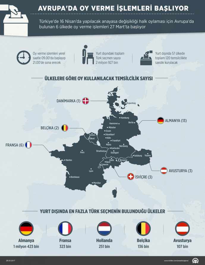 Bugün sandık başına gidilecek ülkeler, Almanya, Avusturya, Belçika, Fransa, Danimarka ve İsviçre oldu. Bu ülkelerde oy verme işlemi 9 Nisan’a kadar devam edecek.