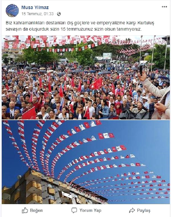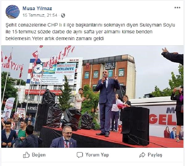Kocaeli Gebze’de CHP İlçe Başkanı Musa Yılmaz, 15 Temmuz darbe girişiminin 2’nci yıl dönümü olan pazar günü, sosyal medya hesabından paylaşımlarda bulundu. Musa Yılmaz’ın, ’15 Temmuz yazılmış bir senaryodur’, ’15 Temmuz senaryosu önceden yazılmış 20 Temmuz sivil darbenin alt yapısıydı’, ‘Biz kahramanlıkları destanları dış güçlere ve emperyalizme karşı Kurtuluş Savaşında oluşurduk. Sizin 15 Temmuzunuz sizin olsun, tanımıyoruz’ gibi paylaşımlarda bulundu. Musa Yılmaz’ın paylaşımına Ak Partili yöneticiler tepki gösterdi.