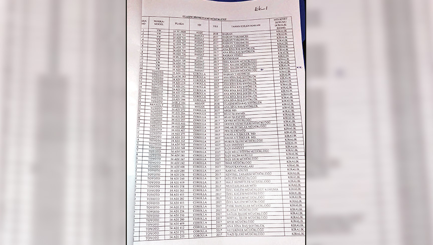 Halkın parasını har vurup harman savuran belediyede beş belediye başkan yardımcısı makamı olmasına rağmen 11 makam aracı kiralandı. Volkswagen Passat marka bu araçlardan 6’sının ise kime tahsis edildiği ve nerede kullanıldığı ise bilinmiyor. Belediye Başkanvekili için iki adet makam aracı tahsis edilirken özel kalem için de 10 adet araç tahsis edilmiş.