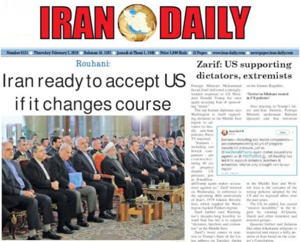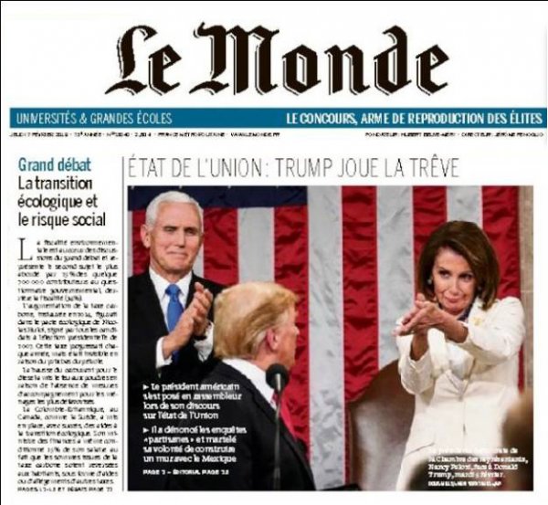 Fransa Cumhurbaşkanı Macron’un, Sarı Yeleklilerin protestoları sonucu ülkesinde yaşanan toplumsal bölünmeyi gidermek amacıyla başlattığı “Ulusal Müzakere”ye ana sayfada yer veren gazete, Birliğin Durumu konuşmasını yapan Donald Trump, bu yılki konuşmasında ana tema olarak seçtiği birlik ve partilerarası iş birliği mesajını da manşetten paylaştı.