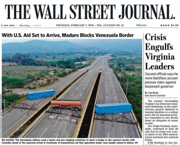 Venezuela ordusunun, ülkede darbe çağrısı yapan ABD ve müttefikleri tarafından hazırlanan yardımın ülkeye girmesini engellemek amacıyla önlemler alarak Kolombiya ile arasındaki sınır köprüsünü petrol tankerleriyle kapatması, WSJ’ın manşet konusu oldu. Gazete, ABD’nin Virginia Valisi Demokrat Northam’ın ırkçı Ku Klux Klan grubunun kıyafetleriyle olan fotoğrafları bulunduğu ortaya çıkmasının ardından devam eden tartışmaları da gündeme taşıdı.