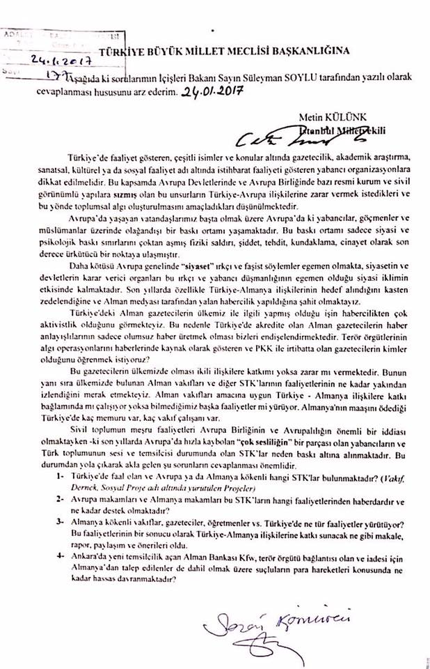 AK Parti İstanbul Milletvekili Metin Külünk, Almanya’nın, 15 Temmuz darbe girişiminin arkasındaki kirli akla teslim olduğunu iddia ederek, “Şu anda Avrupa; FETÖ’nün, PKK’nın, sol terör örgütlerinin üssü haline geldi. Almanya şimdi bunlara, orada yaşayan Müslümanların içerisinden devşirdikleri, tıpkı FETÖ gibi dindarlık kimliği altında ajanlaştırmaya başladığı kişileri de ilave ediyor” dedi. Külünk, konuyla ilgili TBMM Başkanlığına sunduğu soru önergesinde, İçişleri Bakanı Süleyman Soylu’nun sorularını cevaplamasını istedi. Metin Külünk, soru önergesinde, “Türkiye’de faal olan, Avrupa ya da Almanya kökenli hangi STK’ların bulunduğunu, Avrupa ve Almanya makamlarının bu STK’ların hangi faaliyetlerinden haberdar olduğunu ve ne kadar destek olduklarını” öğrenmek istedi.