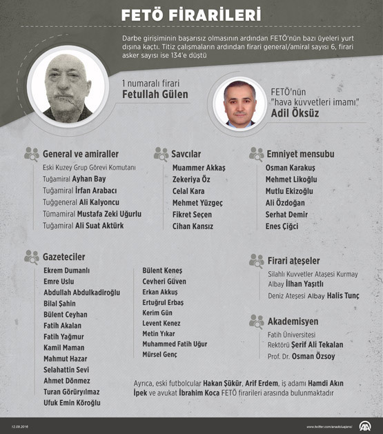 FETÖ’nün darbe girişimine ilişkin soruşturma kapsamında Ankara’daki Akıncı Üssü’nde gözaltına alındıktan sonra salıverilen FETÖ’nün “hava kuvvetleri imamı” olduğu ileri sürülen Adil Öksüz de kaçan isimlerin başında geliyor.