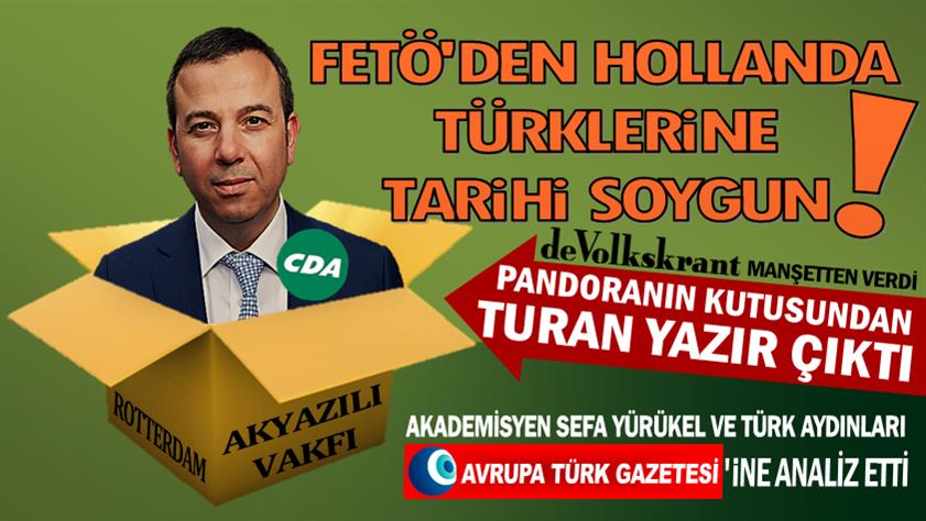 Hollanda’nın en yüksek tirajlı gazetesi De Volkskrant, FETÖ’nün Hollanda Türklerinden nasıl milyonlarca Euro para soyup, mağdur ettiğini ön-sayfadan gündeme ‘Gülen’in kıskacında’ başlığıyla taşıdı. Gündeme taşınan tarihi soygunu gerçekleştiren kuruluşlardan birisinin Rotterdam’da bulunan Akyazılı Vakfı olduğu; vakfının başkanının da, Rotterdam’ın Hristiyan Birlik Parti’li (CDA) belediye meclis üyesi Turan Yazır olduğu ortaya çıktı.
