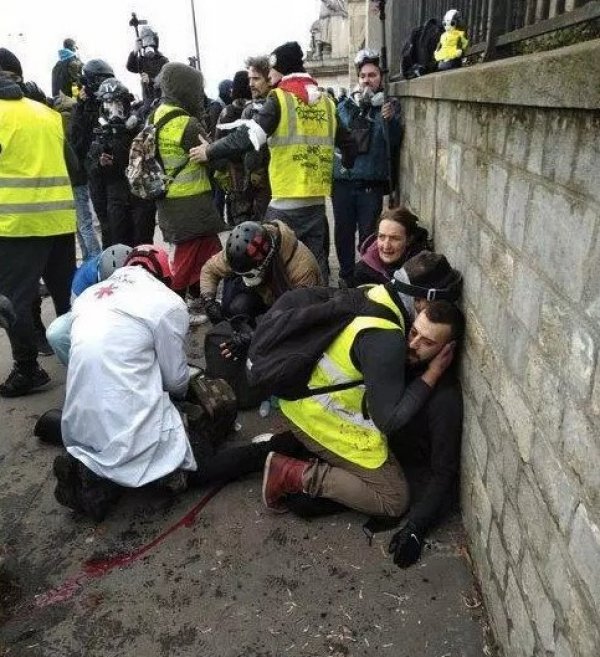 Eli parçalanan eylemciye, diğer Sarı Yelekliler ve eylemcilerin yanında bulunan bir doktor yardımcı oldu. Bir eylemci mağduru “elini görmemesi için” tutarken diğerleri parçalanan eli su ile temizlemeye çalıştı.