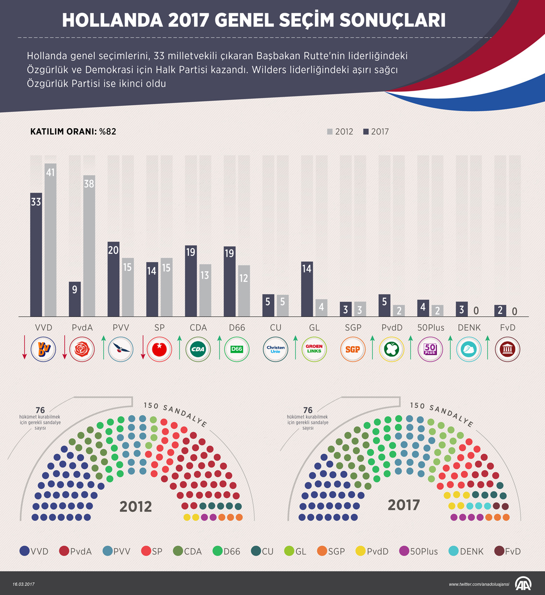 Hollanda genel seçimlerini, açıklanan ilk resmi sonuçlara göre 33 milletvekili çıkaran Başbakan Mark Rutte’nin liderliğindeki Özgürlük ve Demokrasi için Halk Partisi (VVD) kazandı. VVD seçimde birinci parti çıkarak İslam karşıtı aşırı sağcı Özgürlük Partisi’ni (PVV) geçse de, 41 milletvekili kazandığı 2012 seçimlerinin gerisinde kaldı.