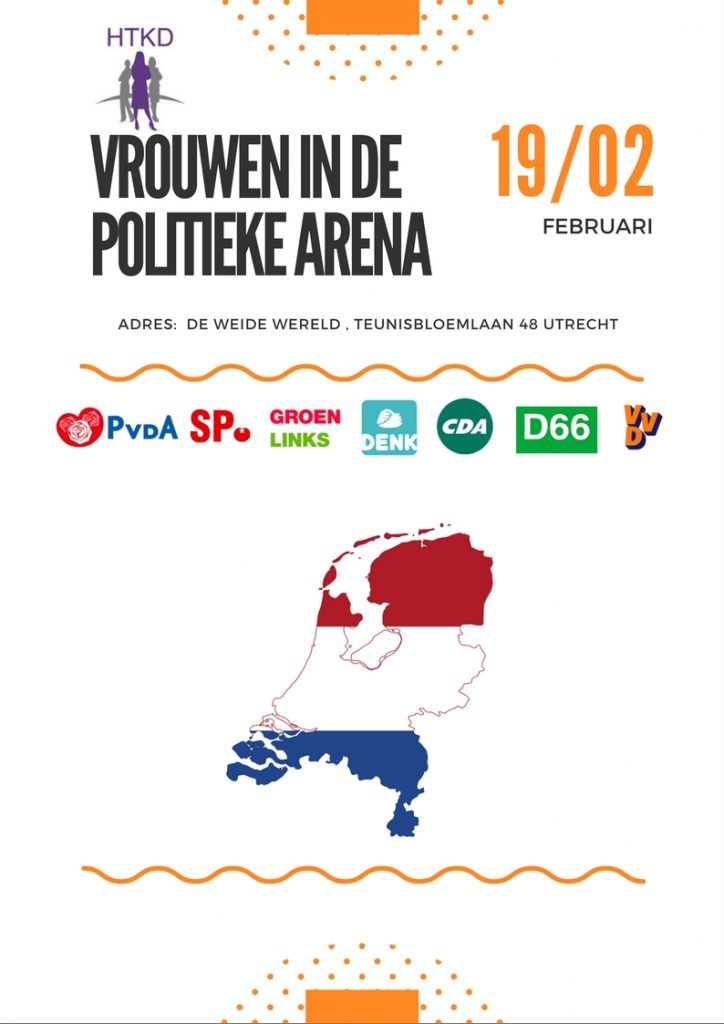 19 Şubat 2017 Pazar günü, saat: 13.00-16.00 arası, Teunisbloemlaan 48 Utrecht adresinde bulunan De Weide Wereld’te yapılacak ‘Siyaset Meydanında Kadınlar’ faaliyetine DENK, PvdA, SP, YeşilSol, CDA, VDD ve D66 partilerinden milletvekili adayları katılarak, vatandaşların sorularına yanıtlar verecekler.
