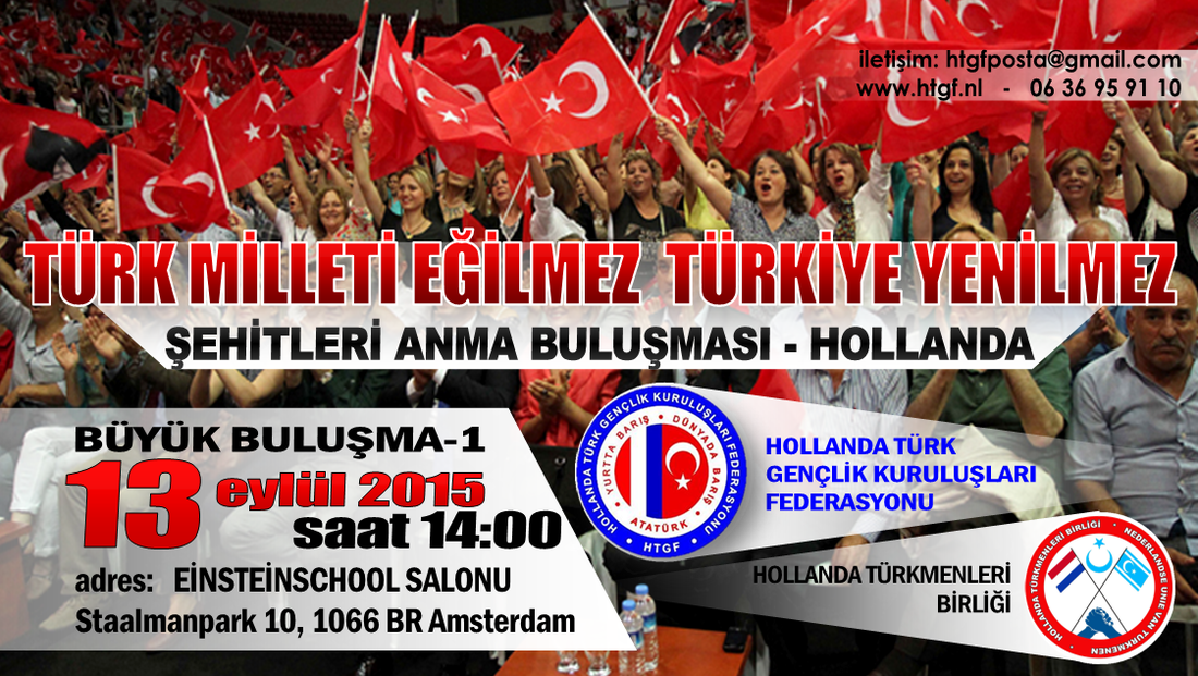 “TÜRK MİLLETİ EĞİLMEZ, TÜRKİYE YENİLMEZ” parolasıyla Şehitleri anma buluşması Hollanda’nın başkenti Amsterdam’da 13 Eylül 2015 tarihi, Pazar günü, saat: 14:30’de Staalmanpark 10, 1066BR Amsterdam adresinde bulunan Einsteischool Salonu’nda yapılacağı duyuruldu.