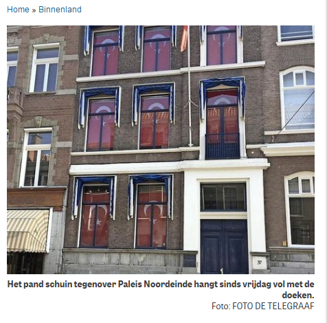 Noordeinde Sarayının karşısında bulunan bina, cuma gününden itibaren bez parçaları ile dolu (Het pand schuin tegenover Paleis Noordeinde hangt sinds vrijdag vol met de doeken.) diyerek, Telegraaf olarak asıl provakasyonu kendilerinin yaptığını kanıtladı.
