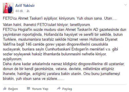 Yakışır, FETÖ‘cü Ahmet Taşkan’ın Hollanda medyasındaki ahlaksız ifadelerine karşı, sosyal-medya sayfasından şu ifadelerde bulunarak karşı kampa geçmek istediğini ilan etmiş oldu: