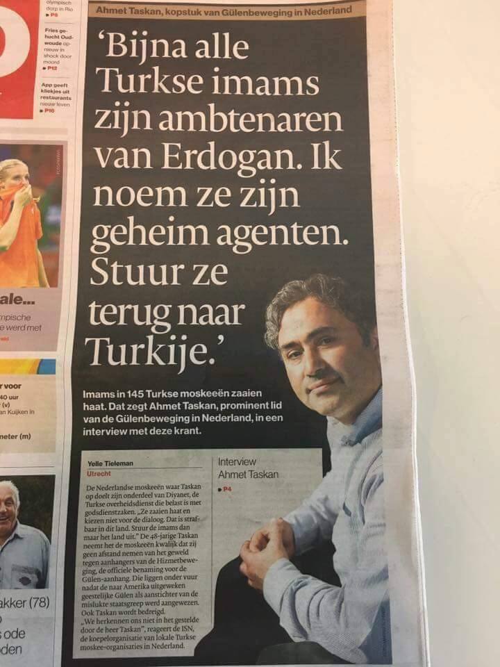 FETÖ’nün iş dünyasındaki ve sivil toplumdaki kolu HOGİAF’ın (Hollanda Genç İş Adamları Federasyonu) sözcüsü-sekreteri Ahmet Taşkan, geçtiğimiz günlerde Hollanda’nın yüksek tirajlı AD gazetesine yaptığı kan donduran açıklamalarda, Hollanda’daki Diyanet imamlarının MİT ajanı olduğu suçlamasını yönelterek, Türk camilerin kapatılması gerektiğini ve Türklerin Hollanda’da güvenliği tehlikeye attıklarını bahane ederek tatil dönüşü Hollanda Türklerinin de fişlenmesi gerektiğini açık açık savunup tavsiye etmişti.