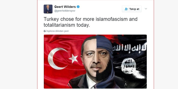 Türkiye’deki ‘evet’ zaferini yediremeyen Wilders, “Türkiye bugün daha fazla islamofaşizmi ve totalitarizmi seçti’ diyerek sosyal medyadan nefret kustu.