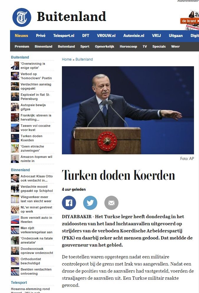 Hollanda’nın popüler gazetelerinden De Telegraaf, gerçekleştirilen operasyon üzerinden algı operasyonu yaparak “Türkler Kürtleri katlediyor” başlığı attı. Haberin içeriğinde ise “Türk ordusu 8 Kürt’ü katletti” gibi ifadeler yer aldı.