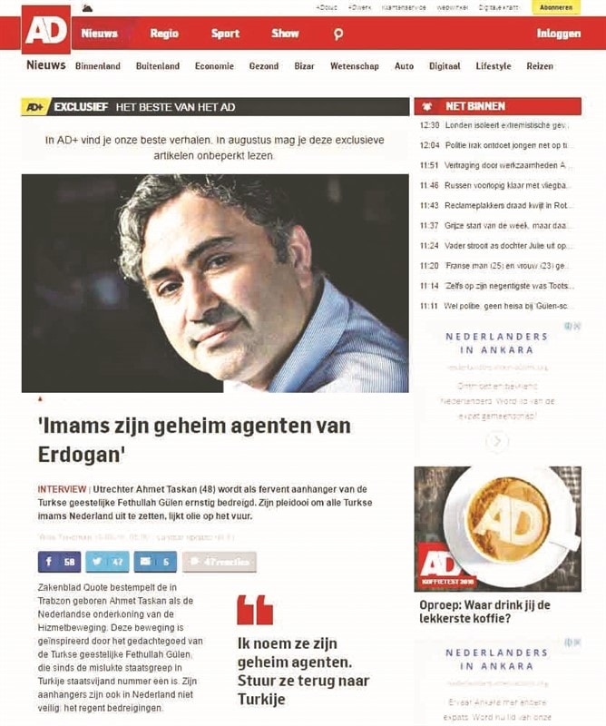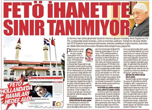Pensilvanya’nın ardından ikinci üs olarak Avrupa’yı merkez haline getiren FETÖ, icraatlarına burada devam ediyor. FETÖ elemanları bulundukları ülkelerde Diyanet İşleri Başkanlığı’na bağlı görevlilere yönelik ajanlık suçlamasında bulunarak hedef gösteriyor. FETÖ’nün Hollanda’daki en üst yöneticileri arasında yer aldığı bildirilen Hollanda Genç İşadamları Federasyonu (HOGİAF) Genel Sekreteri Ahmet Taştan, ülkenin yüksek tirajlı gazetelerinden Algemeen Dagblad’da (AD) verdiği röportajda, Hollanda Diyanet Vakfı’na (HDV) bağlı 140’ı aşkın caminin din görevlisini ülkenin huzurunu bozduğunu iddia ederek, “Onlar Erdoğan’ın memurları ve bir gizli ajan. Derhal yurtdışı edilmeli” şeklinde alçakça iftiralarda bulundu.
