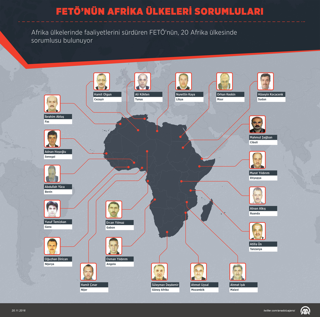 Afrika ülkelerinde faaliyetlerini sürdüren FETÖ’nün, 20 Afrika ülkesinde sorumlusu bulunuyor. Terör örgütünün Mısır sorumlusunun Orhan Keskin, Libya sorumlusunun Nurettin Kaya, Tunus sorumlusunun Ali Kökten, Cezayir sorumlusunun Hamit Olgun olduğu belirlendi.