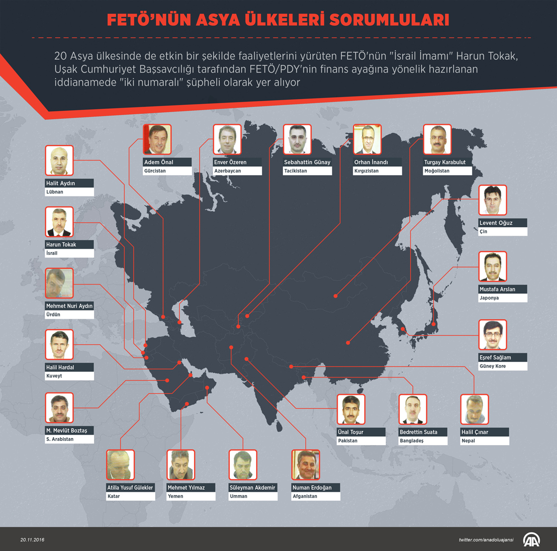 20 Asya ülkesinde de etkin bir şekilde faaliyetlerini yürüten FETÖ’nün İsrail sorumlusunun Harun Tokak, Suudi Arabistan sorumlusunun Mevlüt Boztaş, Japonya sorumlusunun Mustafa Arslan, Çin sorumlusunun Levent Oğuz, Pakistan sorumlusunun Ünal Toşur olduğu öğrenildi.