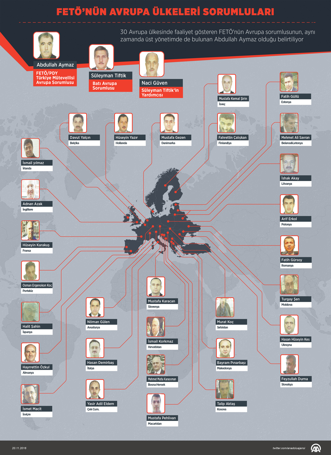 30 Avrupa ülkesinde faaliyet gösteren FETÖ’nün Almanya sorumlusunun Hayrettin Özkul, İngiltere sorumlusunun Adnan Azak, Fransa sorumlusunun Hüseyin Karakuş, Belçika sorumlusunun Davut Yalçın olduğu kaydedildi.