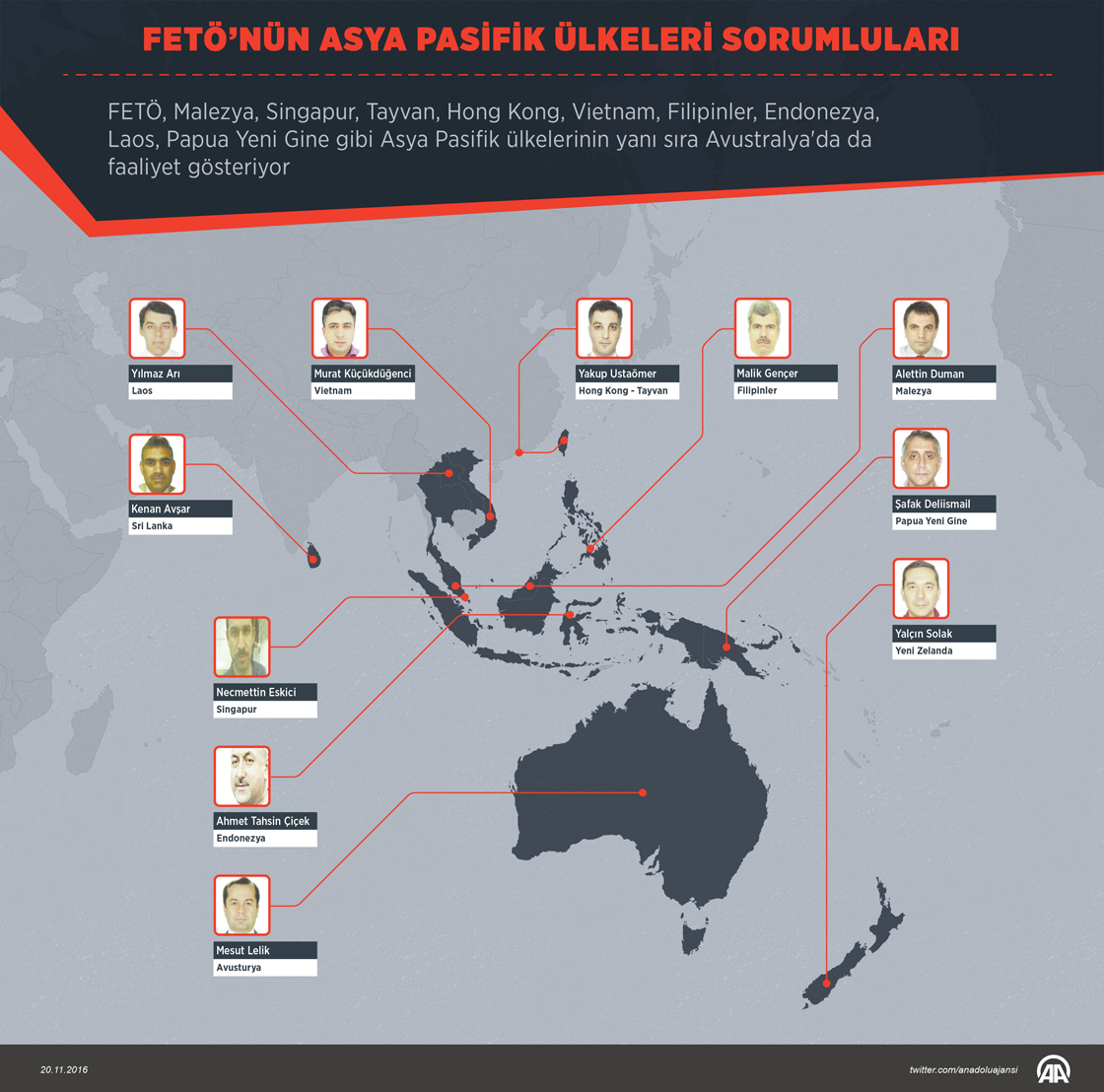 FETÖ, Malezya, Singapur, Tayvan, Hong Kong, Vietnam, Filipinler, Endonezya, Laos, Papua Yeni Gine gibi Asya Pasifik ülkelerinin yanı sıra Avustralya’da da faaliyet gösteriyor.