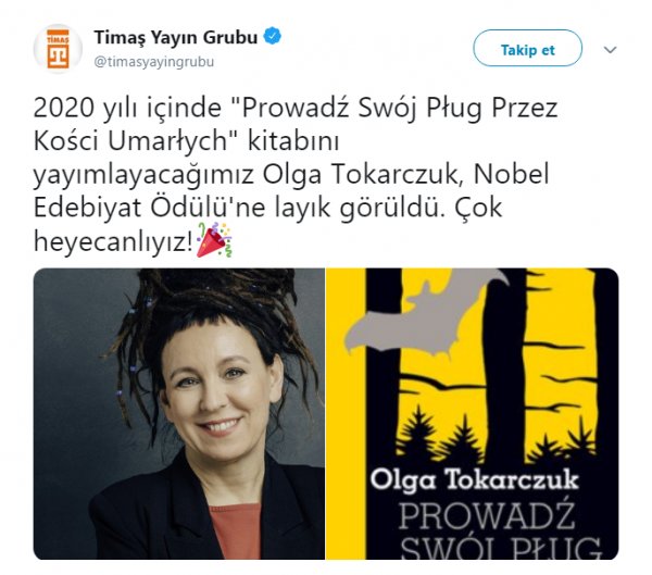 Nobel Edebiyat Ödülünün açıklanmasının hemen ardından Timaş Yayın Grubu, Twitter’dan bir açıklama yaptı. Açıklamada Olga Tokarczuk’un yeni kitabının Timaş Yayın Grubu tarafından 2020 yılında çıkacağı müjdelendi.