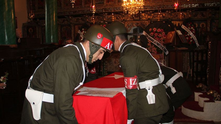 Cenazesi Gökçeada’ya getirilen Banogo için, Zeytinliköy’deki Aya Yorgi Kilisesi’nde askeri tören düzenlendi.