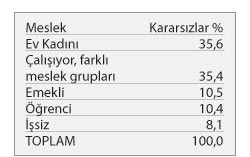 Araştırma verilerine baktığımızda, kararsızların çoğunluğunun kadın olduğunu görüyoruz. Yine araştırma sonuçlarında EV KADINLARININ %17.4’Ü KARARSIZ diye bir veri yayınlandı. Belki rakamlara baktığımızda bu sonuç bizim çok dikkatimizi çekmedi. Birbirinden üç beş puan farkla her meslek grubunda kararsızların olduğunu gördük ve dedik ki, toplumun her meslek grubunda birbirine yakın oranda kararsız var. Hâlbuki tabloyu tam olarak yorumlayabilmek için, Türkiye’deki seçmenin gerçek sayılarına bakmak lazım. Ülkemizdeki HER ÜÇ SEÇMENDEN YAKLAŞIK BİRİNİN EV KADINI olduğunu düşünürsek, ev kadınlarının %17.4’ü kararsız dediğimizde bahsettiğimiz rakamın büyüklüğünü daha iyi anlarız. Bahsettiğimiz %17.4’ün büyüklüğünü anlamak için şu tabloya bakalım; Tabloda da görüldüğü gibi,toplam kararsızlar içerisinde ev kadınlarının oranı %35.6. Biraz daha ileri gidelim; toplam kararsızların çalışma durumlarına baktığımızda kararsızların %64.6’sının çalışmadığını görüyoruz. Ev kadını, emekli, öğrenci ve işsizler toplam kararsızların yaklaşık üçte ikisini oluşturuyor. Önümüzdeki günlerde kampanyalar başlayacak, kararsızları etkilemek için “EVET” ve “HAYIR” kampanyasını yürütecek olanlar 16 Nisan tarihine kadar bu kitleyi etkileyebilmek için tüm performanslarını ortaya koyacaklar.
