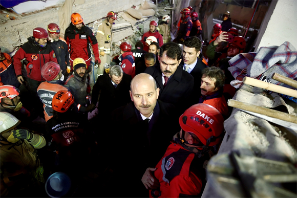 Alınan bilgiye göre, Soylu ve Kurum kriz masasından ayrılarak enkaz alanına geldi. Çalışmalar hakkında bilgi alan Soylu ve Kurum daha sonra yıkılma tehlikesi bulunan diğer binayı da inceledi.